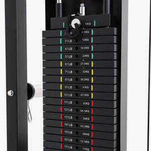 There are two stacks of 90kg weights on this machine with 2:1 pulley ratio, which allow you to select the right weight based on your fitness goals.