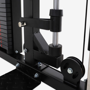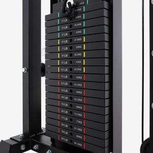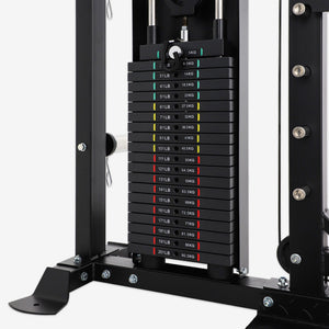 The pin-loaded stack weights are connected to the functional trainer and cable crossover stations from the rear of the structure, offering a quick, seamless, and safe solution for weight level selection!