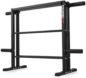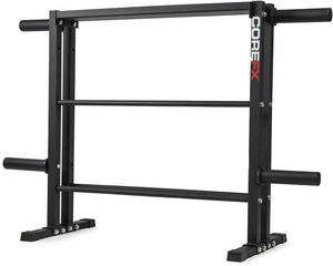 The COREFX Multi-Weight Storage Rack is a space-saving fitness storage solution for home and commercial gyms. The three tier unit with four storage posts can store and display kettlebells, Dumbbells and olympic weight plates.