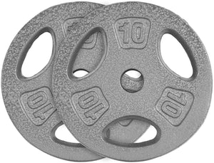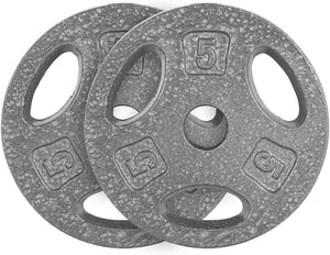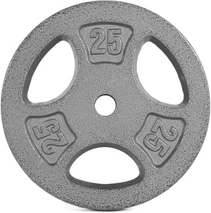 The CAP Barbell Standard Grip Plates with a machined 1-inch center hole and baked enamel finish are available in 25, 10, 5, and 2.5 pounds. The 3 hole grip design makes carrying these weights easy and efficient. Store these weights on a rack made for standard weights and use them with a bar that has a 1-inch diameter in width.