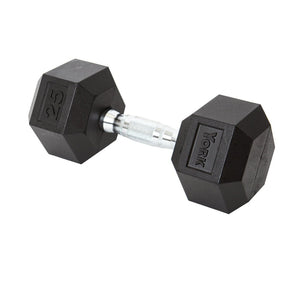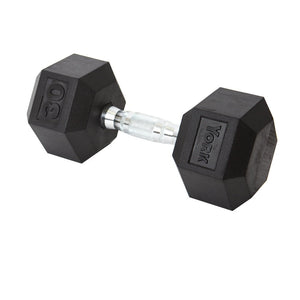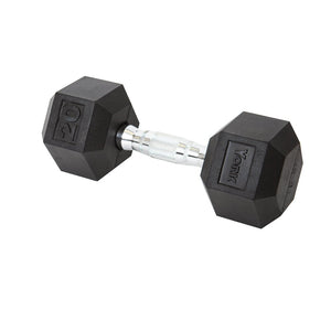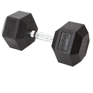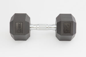 The YORK® Rubber Hex Dumbbell features durable rubber-covered heads for increased safety and comfort. The rubber coating increases durability, protects flooring and equipment, enhances appearance, diminishes noise, and is easy to clean. The heads are permanently affixed to a thick solid steel shaft improving the strength of the head / handle joint. The knurled chrome handles are ergonomically contoured to fit comfortably in the palm of the user. Rubber Hex dumbbells are a great addition to any workout space.